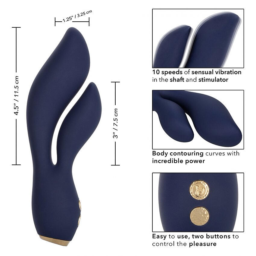 Răsfățați-vă cu desfătarea personalizată în timp ce arborele curbat și teaser-ul trec în ritmul a 10 niveluri de viteză de vibrație sincronizate. Controlați această varietate de opțiuni orgasmice cu butonul de control ușor de atins. Aparatul de masaj elastic este concretizat dintr-un silicon superior din punct de vedere igienic, cu accente decorative uimitoare placate cu aur.