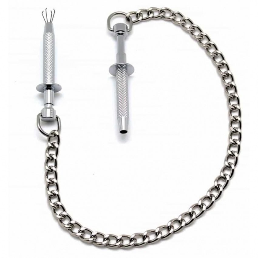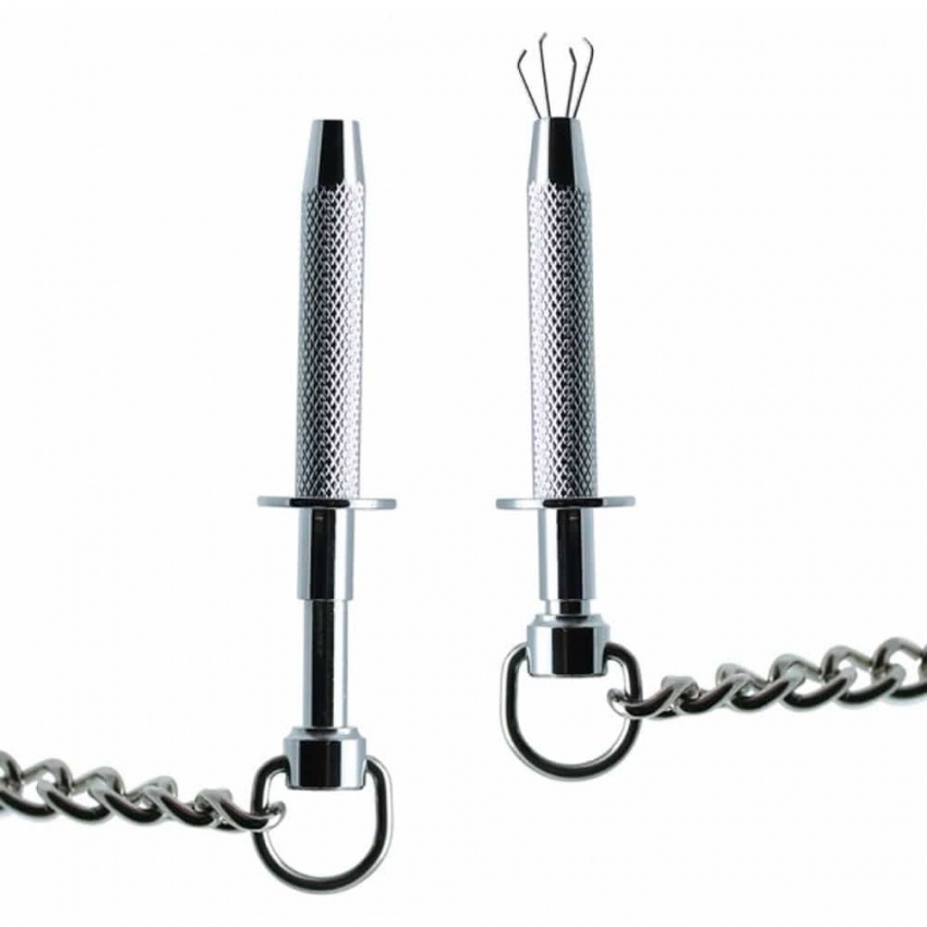 Nipple Clamps este un set de cleme metalice de nuanță argintie, ce este prins cu un lanț metalic. Este perfect pentru nevestele care vor să stimuleze puternic sfârcurile.