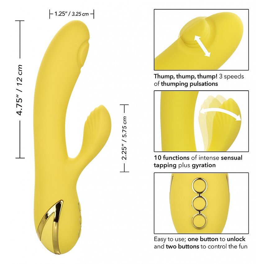 Lungime Totală: 21.6 cm Lungime Inserabilă: 12 cm Diametru: 3.25 cm Culoare: Galben Material: Silicon Livrare: Confidențială Se încarcă complet în 150 minute Până la 60 minute de funcționare cu o încărcare Are vibrații Sigur pentru corp 3 nivele de viteză 10 tipuri de vibrații Rezistent La Apă Reîncărcabil Încărcare Prin USB Brand: CalExotics