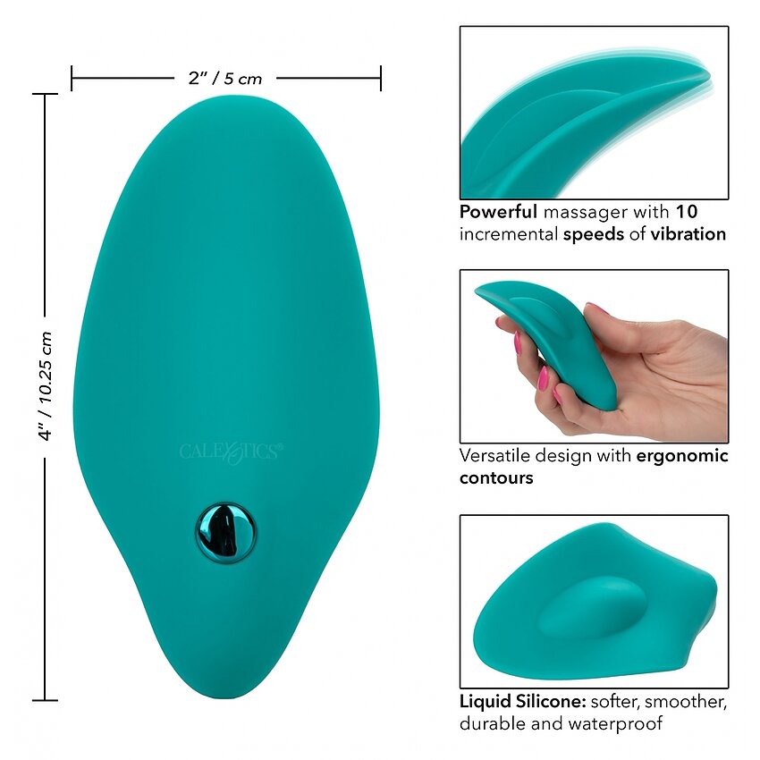 Lungime Totală: 10.25 cm Diametru: 5 cm Culoare: Turcoaz Material: Silicon Livrare: Confidențială Se încarcă complet în 150 minute Până la 60 minute de funcționare cu o încărcare Are vibrații Sigur pentru corp 10 nivele de viteză Rezistent La Apă Reîncărcabil Încărcare Prin USB Brand: CalExotics