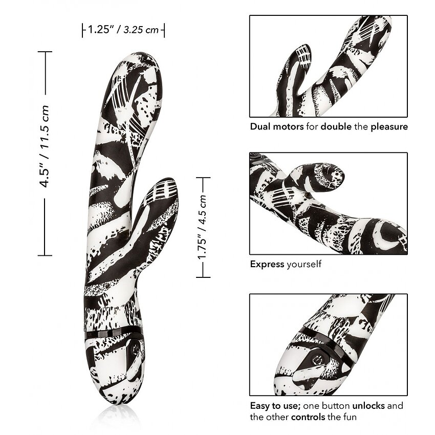 Lungime Totală: 20.4 cm Lungime Inserabilă: 11.5 cm Diametru: 3.25 cm Culoare: Multicolor Material: Silicon Livrare: Confidențială Are acumulator cu Lithium Ion Are vibrații Sigur pentru corp 10 tipuri de vibrații Bateriile sunt incluse Rezistent La Apă Reîncărcabil Încărcare Prin USB Brand: CalExotics