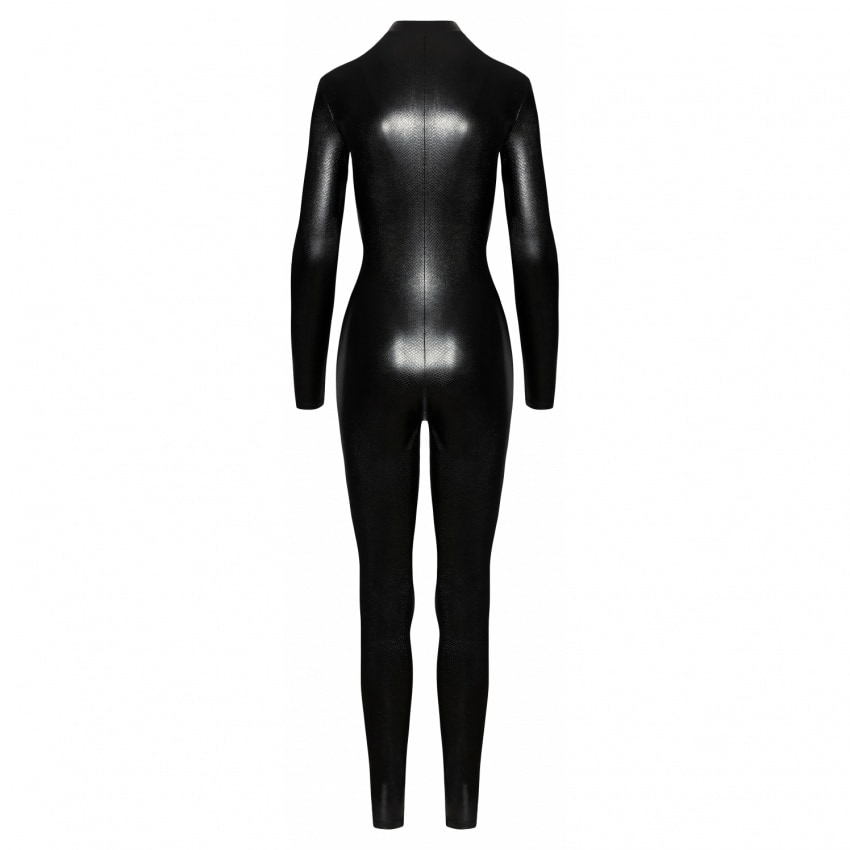 Se potrivește și ca o a doua piele. Salopeta este moale și elastică, ceea ce înseamnă că este cumplit de confortabilă de purtat. Fermoarul metalic cu trei direcții este convenabil și sexual în același timp, fiindcă inițiază de la guler, trece peste zona inghinală și se oprește în bucată de sus a feselor. Poate fi deschis în diverse moduri.