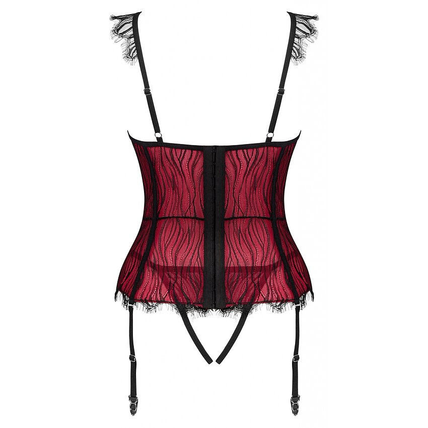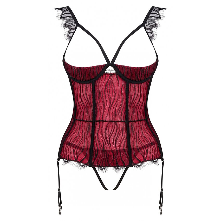 Un corset provocator însușit cu balene verticale întărite, făcut dintr-un material ușor lucitor de culoare roșie acoperit cu o volănaș ușoară de tentă neagră.