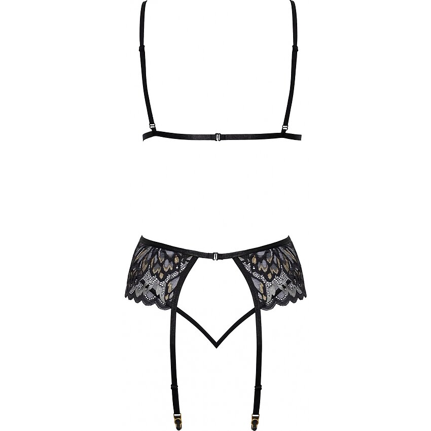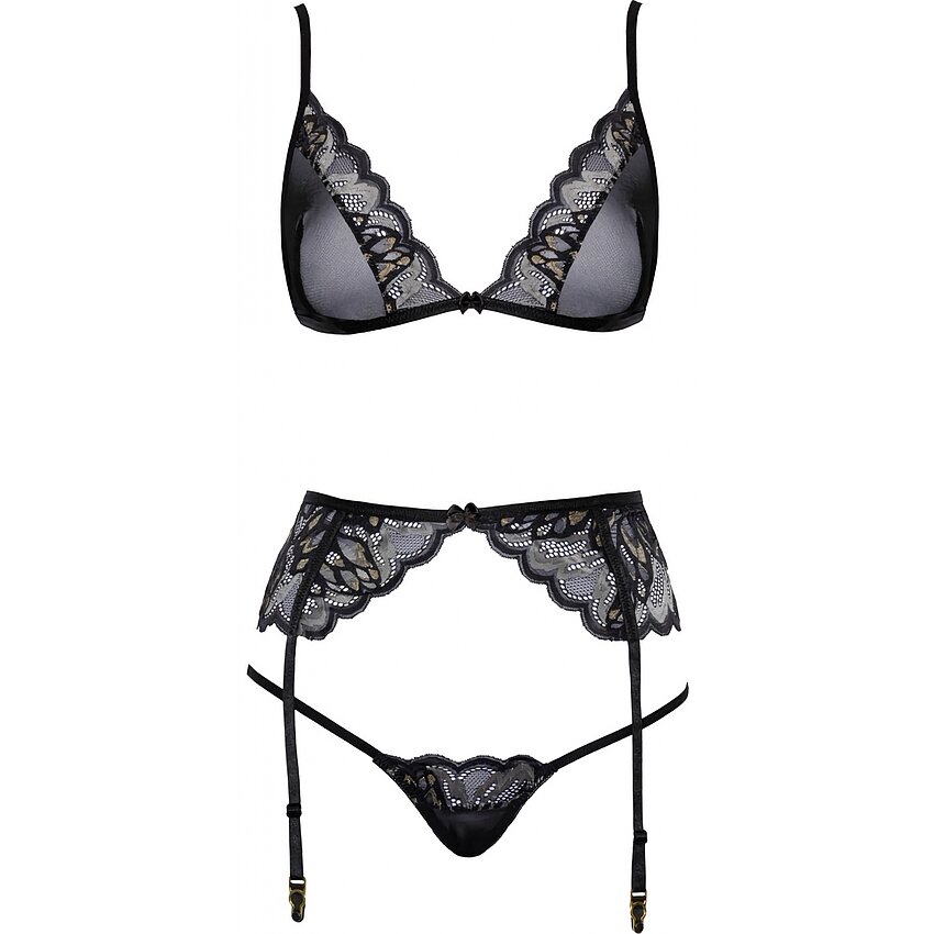 Toate piesele sunt moi și elastice pentru o potrivire foarte confortabilă. Sutienul are bretele ajustabile și o prindere cu cârlig la spate. Portjartierul are, de asemenea, o prindere cu cârlig la spate și bretele reglabile. Chilotul mic, fantezist, este destul de seducător pentru că are două bretele înguste, elastice, care se îmbină în zona picioarelor. Stockings nu sunt incluse.