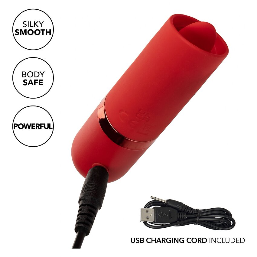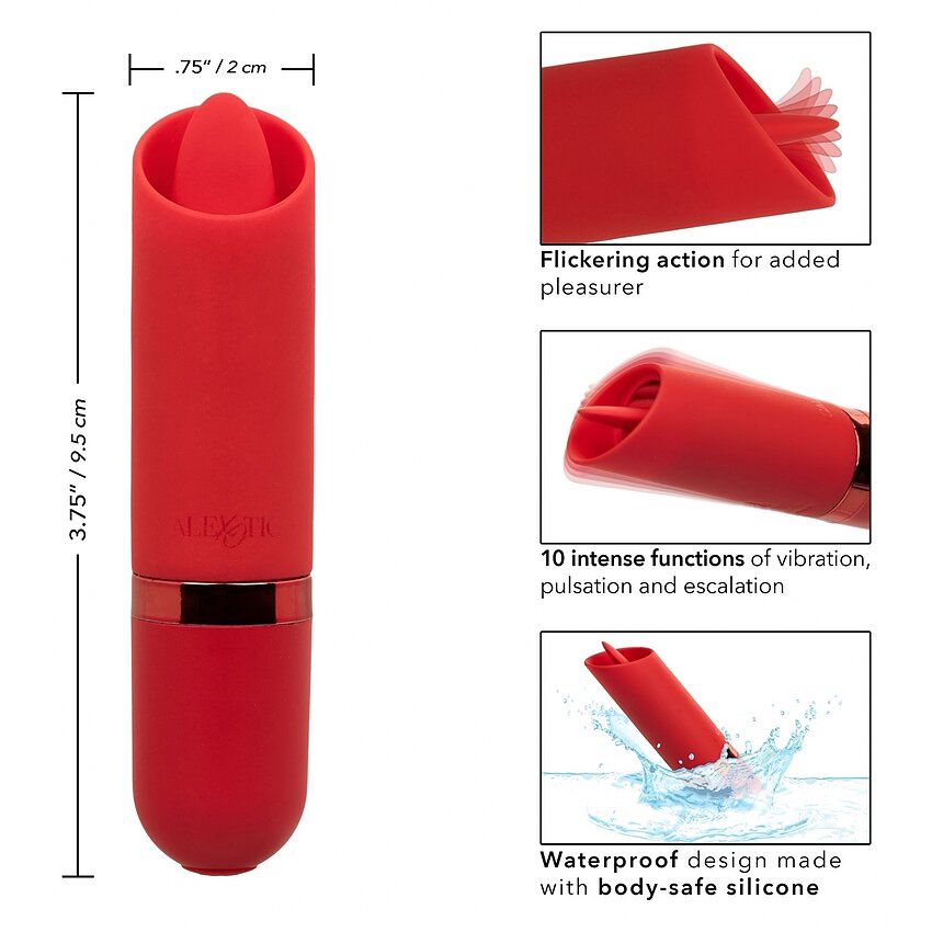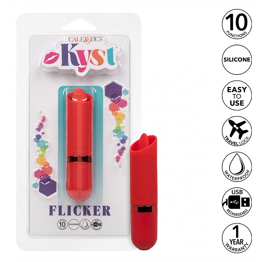 Descoperiți Kyst Flicker Roșu, mini masagerul care vă transformă călătoriile în ocazii de relaxare personală. Acest mic dispozitiv puternic, concretizat din silicon de brandul CalExotics, este dotat cu 10 funcții de vibrație, un cip de memorie și un vârf care pulsează.