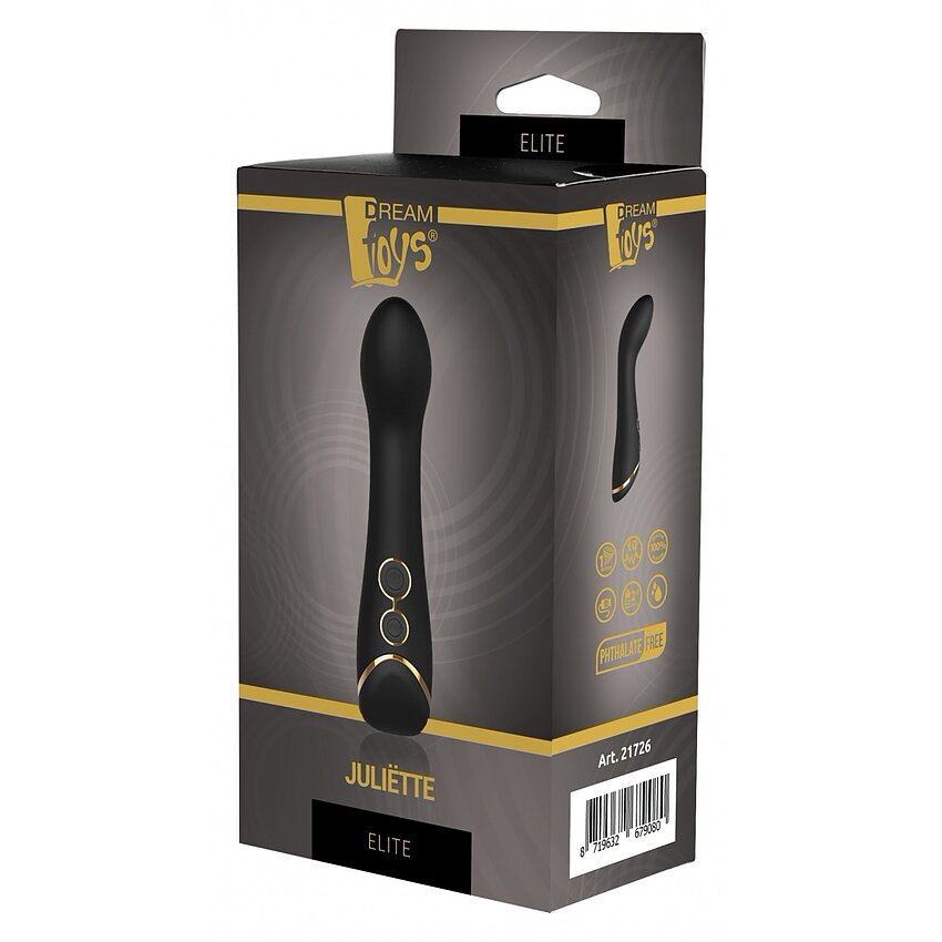 Vibratorul Juliette Punctul G din colecția Elite de la Dream Toys este un vibrator negru cu accente elegante de nuanță aurie și un vârf flexibil, îndoit, care este perfect pentru stimularea punctului G.