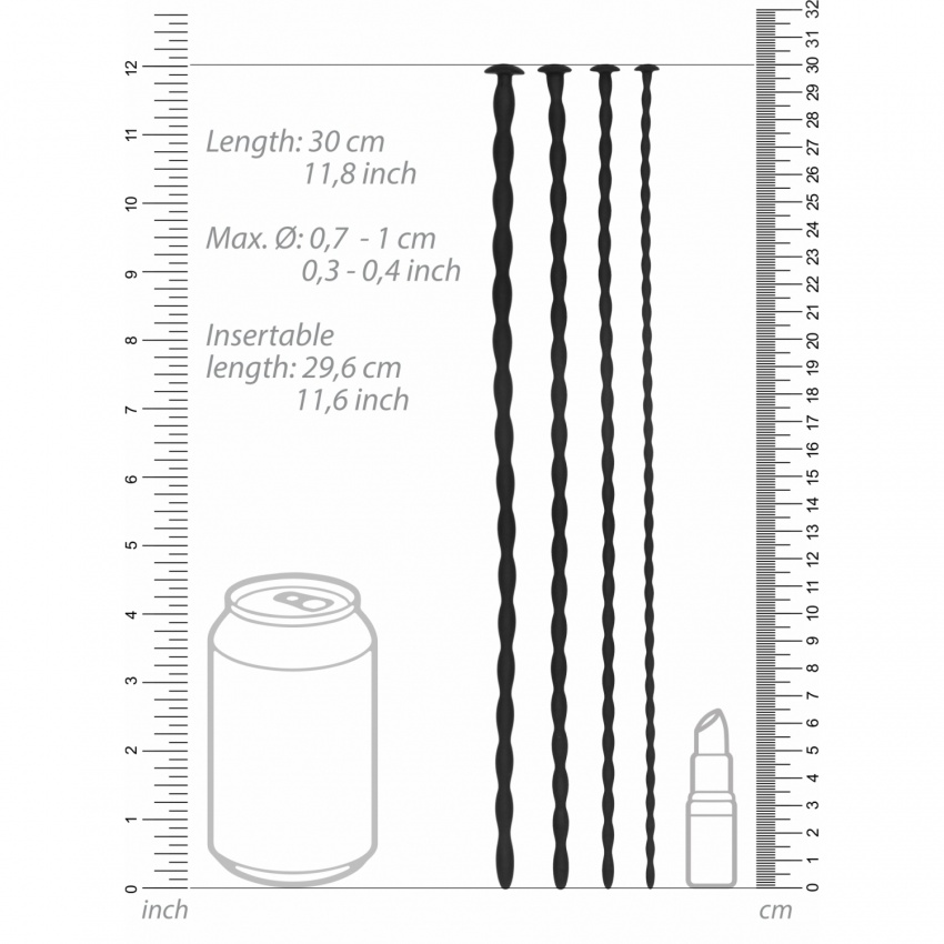 Fabricate din silicon super-neted de calitate medicală, minus ftalați, aceste sonde au o extindere totală de 30 cm pentru a ajunge la adâncime suplimentară! Au o lungime inserabilă de 29,6 cm și 4 diametre diferite, care măsoară 0.7 cm, 0.8 cm, 0.9 cm și 1 cm.