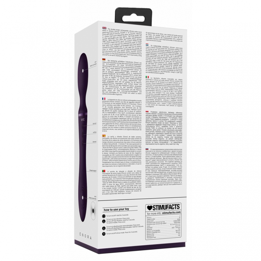 ENORA, baghetă și vibrator cu două capete, se mândrește atât cu un punct final vibrant cât și cu tijă cu 10 programe de vibrații, făcându-l un dispozitiv corect pentru plăcere.