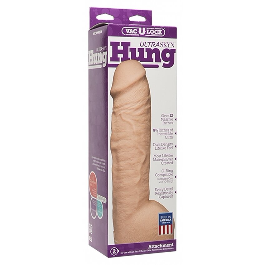 UltraSkyn Hung oferă o extindere considerabilă de peste 30 cm și un calibru incredibil de aproape 7 cm. Confecționat dintr-un material extrem cu densitate dublă, atașamentul Vac-U-Lock Hung, conferă o senzație autentică replicând perfect fiecare detaliu al unui penis, textura, glandul pronunțat și venele proeminente.