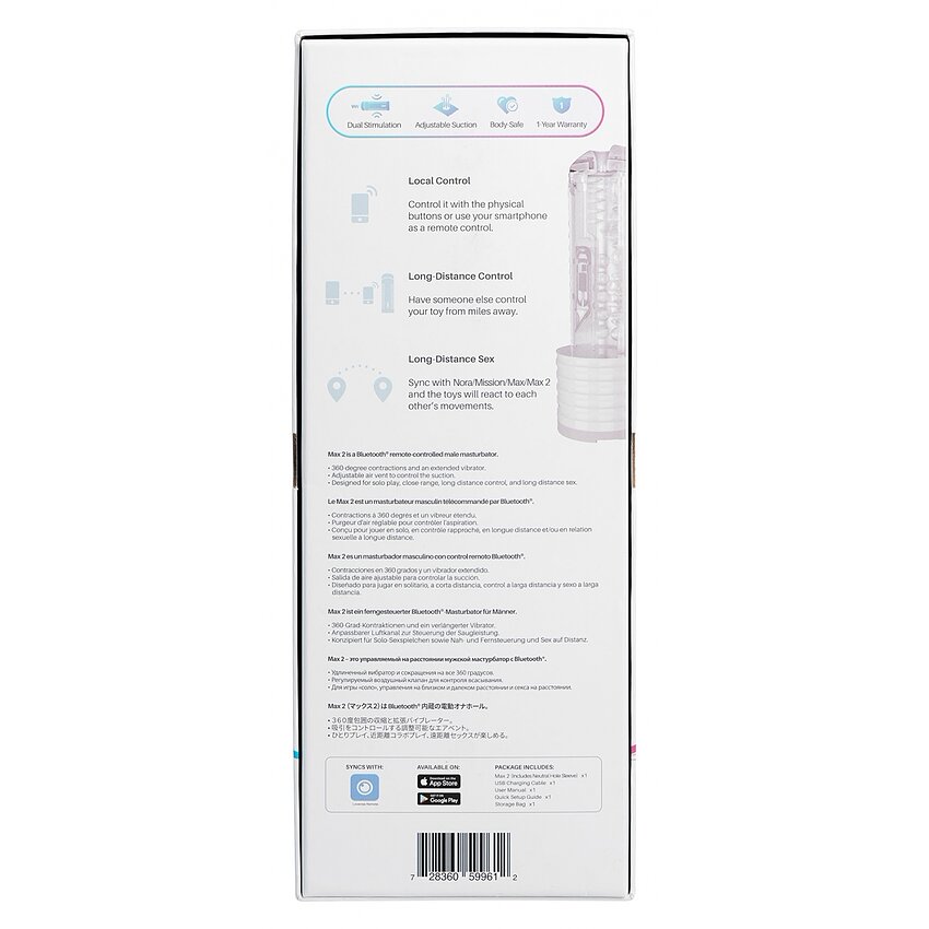MAX 2 este un masturbator inovator care se poate sincroniza cu un alt Max/ Max2 sau cu un vibrator NORA pentru a avea parte de sex virtual. Max 2, la fel ca și predecesorul său, are disponibile în interior perne de aer care imitӑ contracțiile vaginale (3 feluri de contracții), astfel senzațiile sunt cât se poate de realistice. Pe lângă pernele de aer este dotat și cu un vibrator care oferă 7 funcții puternice.