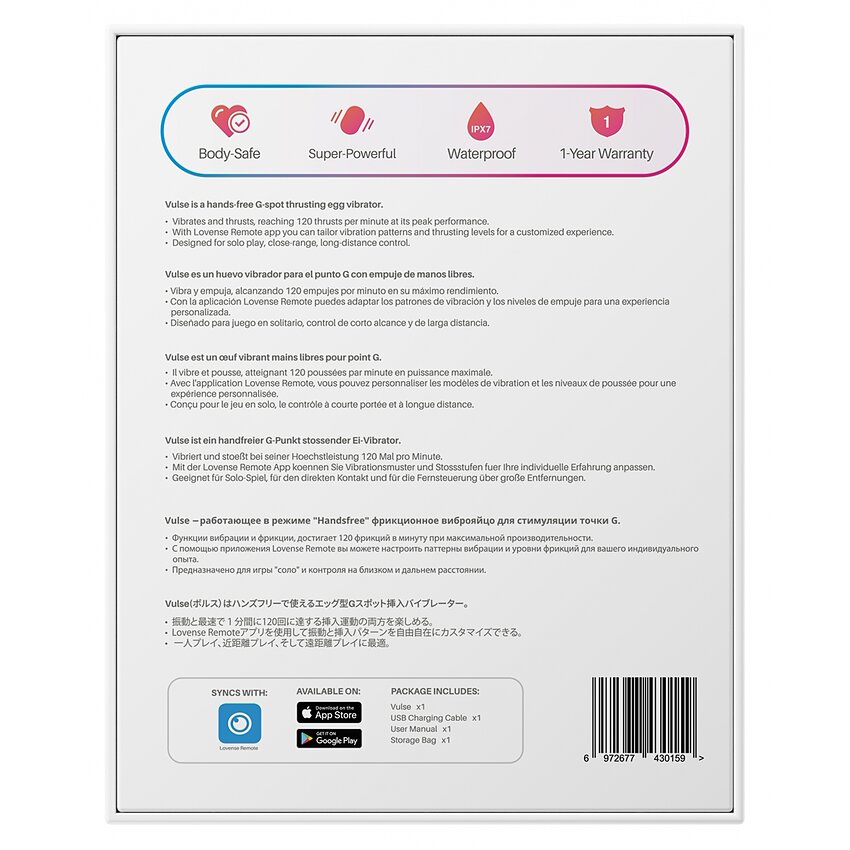 - Dublă stârnire avansată: două motoare independente, unul pentru vibrații intense și altul pentru mișcări înainte-înapoi, concepute pentru o stimulare precisă a punctului G. - Sincronizare cu sunet: dispozitivul reacționează la muzica stocată pe telefon, sunete externe sau ritmul vocii tale, oferind o practică senzorială completă. - Submersibil IPX7: excelent pentru utilizare în apă, dând flexibilitate maximă. - Compatibilitate Webcam: permite interacțiuni captivante și primirea de bacșișuri direct prin produs. - Excepțional de silențios, garantând discreție totală. - Flexibilitate de a gestiona produsele prin sunet, muzică sau mișcare, eliberând membrele utilizatorilor pentru alte activități. - Utilizarea jocurilor integrate Lovense pentru o experiență unică în societatea jocurilor video pentru adulți. - Vulse permite eliberarea mâinilor utilizatorilor prin motorul său puternic, oferind o experiență unică prin combinarea mișcărilor rapide de împingere cu vibrații intense. - Poate atinge viteze de până la 120 de mișcări pe minut și are o mărime de împingere de 10mm. - Vârful neted facilitează inserția ușoară oricând simți nevoia. - Posibilitatea de a sincroniza jucăria cu alte dispozitive pentru a menține intimitatea cu partenerul tău la distanță sau pentru a avea sex la distanță prin apel video sau vocal. - Controlul grupului duce chat-ul în grup la un nou nivel cu jucăriile Lovense. - Creează-ți propriile vibrații personalizate pentru a se potrivi nevoilor corpului tău sau caută în biblioteca noastră cu peste 100.000+ vibrații unice!