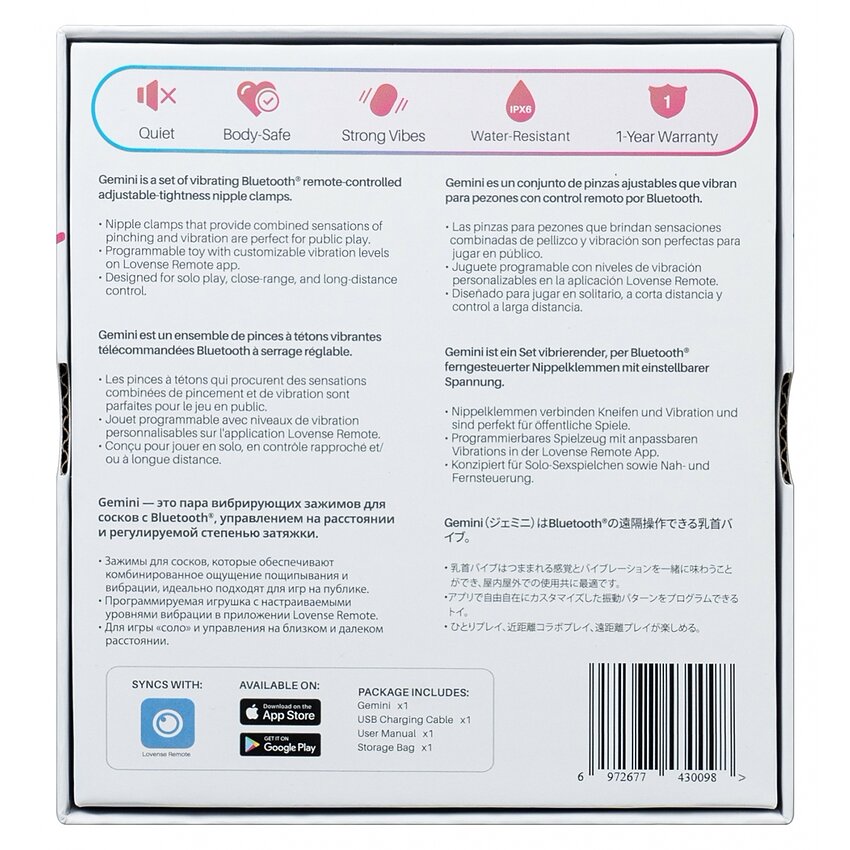 - Tehnologie inovatoare: Lovense Gemini sunt primele clipsuri vibrante ajustabile pentru mameloane din lume, comandate complet printr-o aplicație. - Experiență personalizabilă: Aplicația îți îngăduie să ajustezi forța și exemplarul vibrațiilor, pentru a îți oferi o practică pe gustul tău. - Control de la distanță: Funcțiile de control de la distanță Lovense încuviințează prietenului tău să îndrepte controlul asupra clipsurilor indiferent de locul în care se află, sporind intimitatea chiar și la distanță. - 100% zdravăn la apă - IPX6: protejat împotriva apei sub presiune mare. - Pregătire: Descarcă aplicația Lovense pe telefonul tău și conectează Gemini prin Bluetooth. - Aplicare: Pune clipsurile pe sfârcuri și reglează strângerea pentru confort maxim. - Ușor de purificat - produsul este conceput pentru a fi întreținut cu ușurință. - Bucură-te de o experiență unică și personalizată oferită de Lovense Gemini. - Clipsurile sunt confecționate din silicon de excepție medicală, asigurând confort și certitudine în utilizare. - Inscripția Lovense cu culori variate pe controler - alege-o pe cea care îți place cel mai mult!