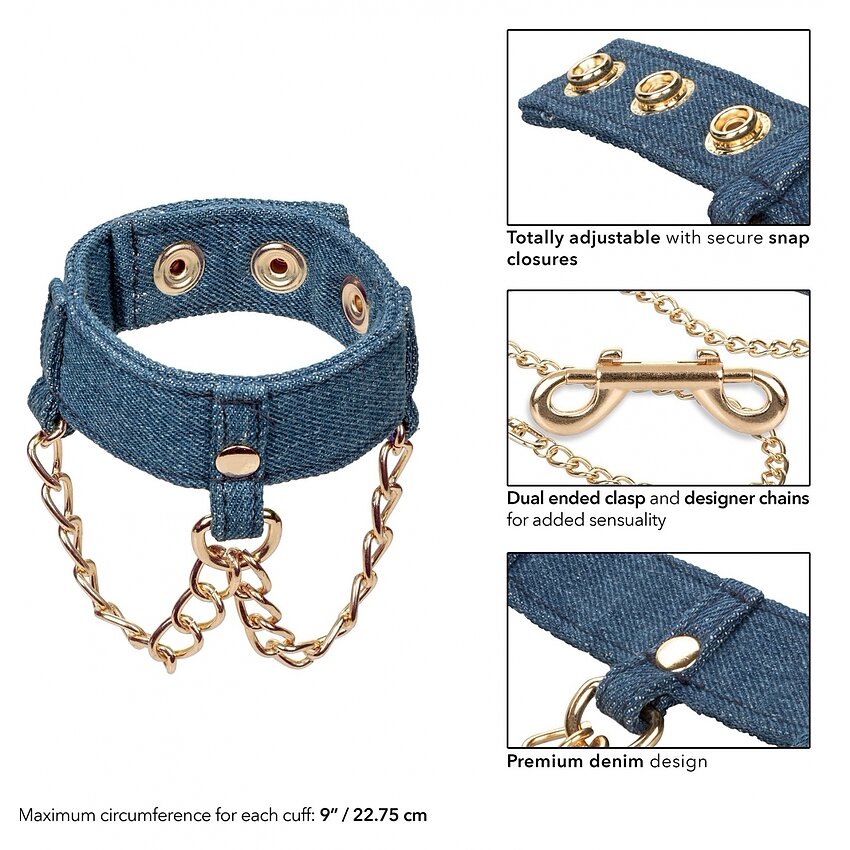 Vă oferim manșetele din colecția de lux de denim Ride Em, un metiaj perfect de stil, confort și reținere pentru aventurile dvs BDSM. Aceste manșete sunt gândite pentru a oferi o potrivire sigură și reglabilă, emanând în același timp o notă de sofisticare cu materialul lor denim.
