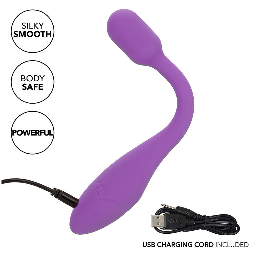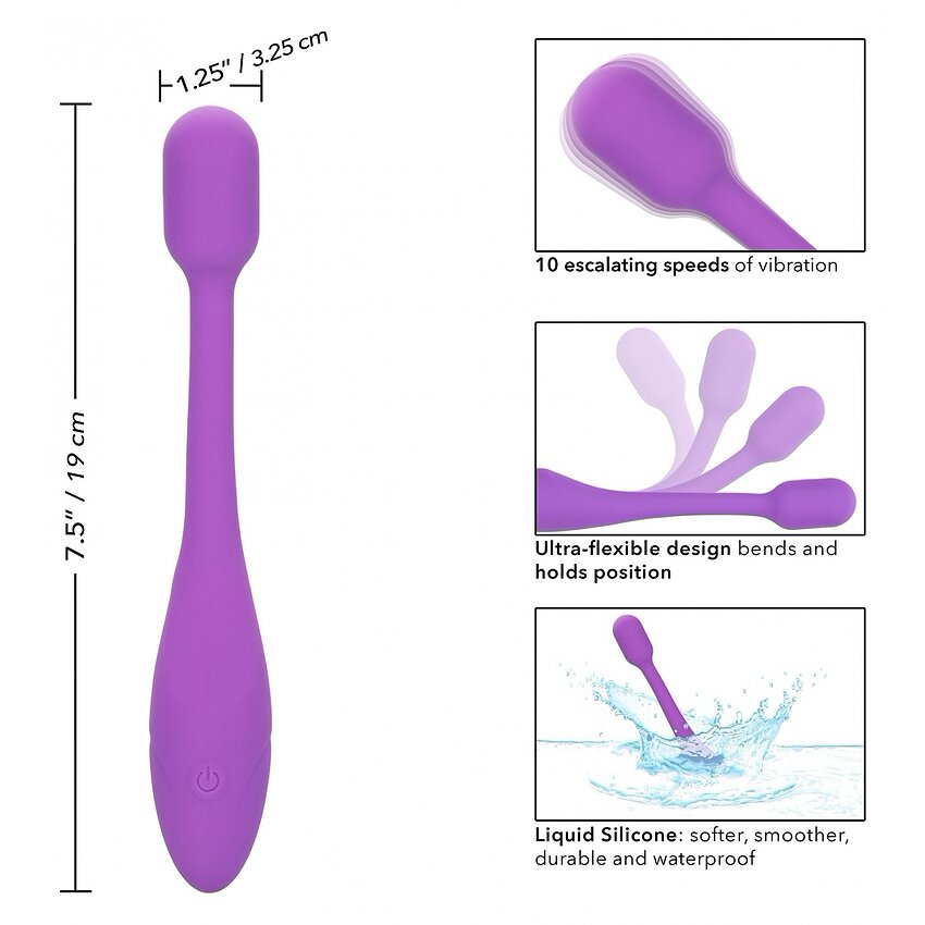 Lungime Totală: 19 cm Diametru: 3.25 cm Culoare: Mov Material: Silicon Livrare: Confidențială Are acumulator cu Lithium Ion Are vibrații 10 tipuri de vibrații Se încarcă complet în 90 minute Până la 80 minute de funcționare cu o încărcare Flexibil Moale Rezistent La Apă Reîncărcabil Încărcare Prin USB Brand: CalExotics