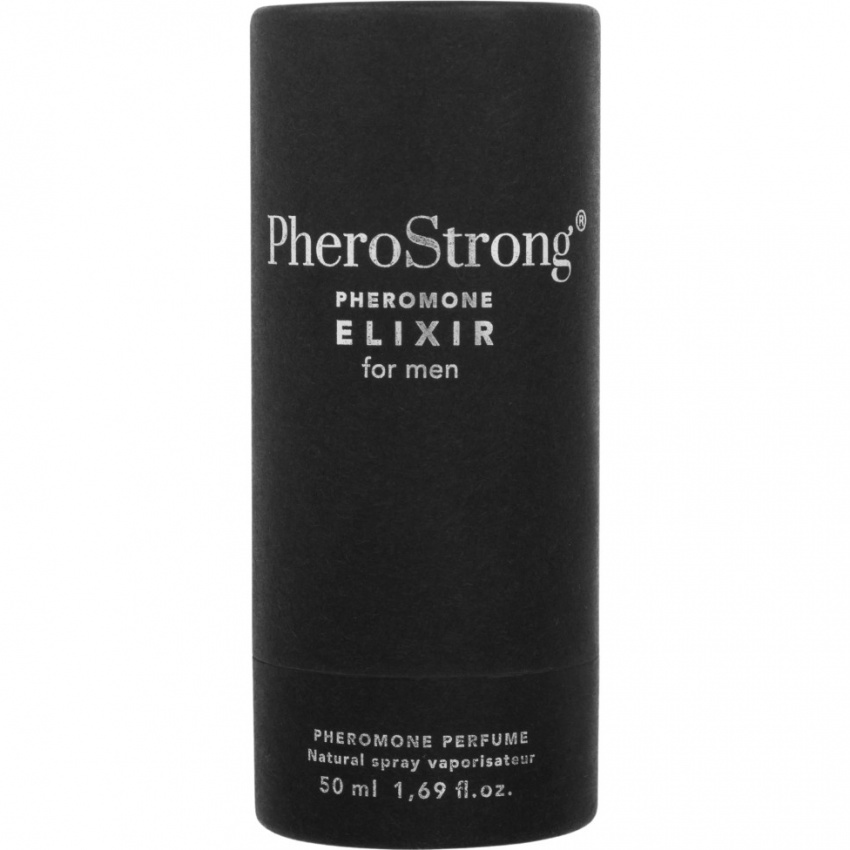 PheroStrong Elixir Feromoni 50 ml: parfum premium cu note de ylang-ylang, bergamot, heliotrop, hedione și trandafir bulgăresc; bază de smirnă și lemn de santal. Flacon compact pentru transport discret. Aplicare pe încheieturi, gât sau după urechi. Uz extern. Evitați raportul cu ochii.