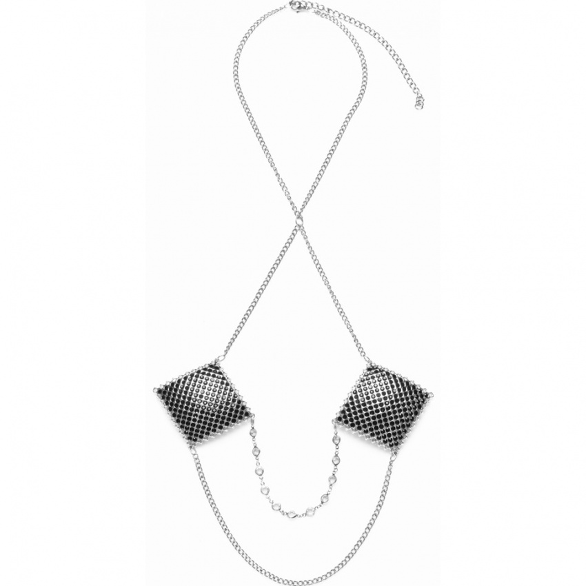 Stickere pentru sâni, pătrate 5,5×5,5 cm, finisaj argintiu cu cristale negre. Două lanțuri pendulare și un lanț central, unul decorat cu rhinestones. Adeziv bio-prietenos, reutilizabile cu film protector. Sigur, discret și ușor — greutate perfectă 54 g.