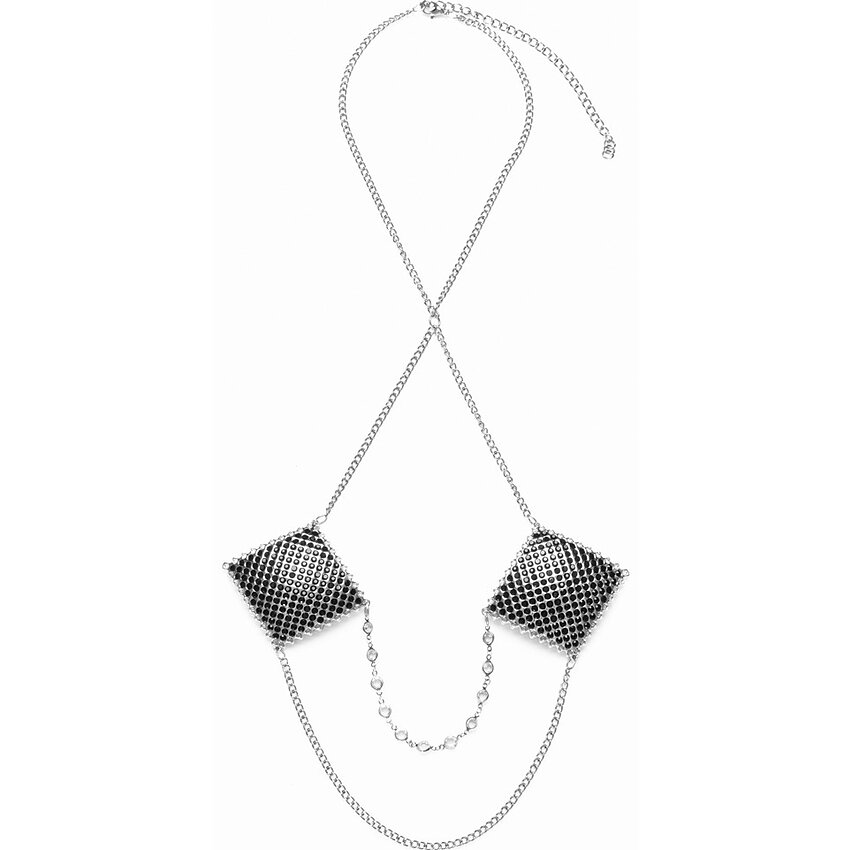 Stickere pentru sâni, pătrate 5,5×5,5 cm, finisaj argintiu cu cristale negre. Două lanțuri pendulare și un lanț central, unul decorat cu rhinestones. Adeziv bio-prietenos, reutilizabile cu film protector. Sigur, discret și ușor — greutate totală 54 g.