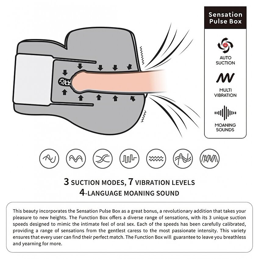 Beneficii și atribute principale: - 3 trepte de aspirație pentru variație tactilă - 7 frecvențe de vibrație pentru reglaje fine - Sunete realiste integrate pentru un plus auditiv discret - Material realist, prietenos cu dermă și flexibil - Parte electronică demontabilă pentru ștergere facilă - Dimensiuni generale: aprox. 19.7 x 20 x 14 cm; greutate indicativă: 2.52 kg - Recomandat pentru utilizare individuală; folosește agent lubrifiere pe bază de apă