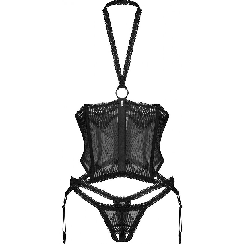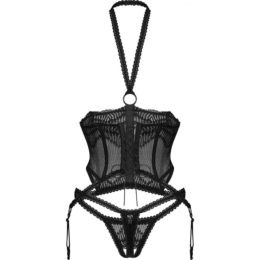 Marime: S-M Culoare: Negru Material: 90% Poliamidă, 10% Elastan Livrare: Confidențială Dresurile se comandă separat. Are decupaj inghinal Sânii Sunt La Vedere Brand: Obsessive