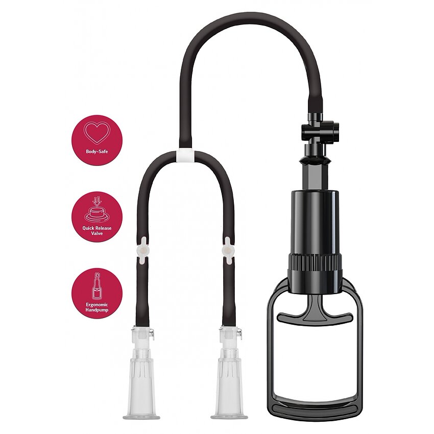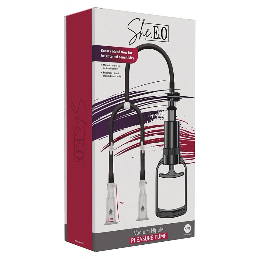Pompiță vacuum She EO pentru stârnire a sfârcurilor: aplicare simplă, pompă manuală pentru vid controlat, supapă ce menține aspirația după îndepărtarea furtunului/pompei și eliberare rapidă. Crește sensibilitatea și senzațiile locale.