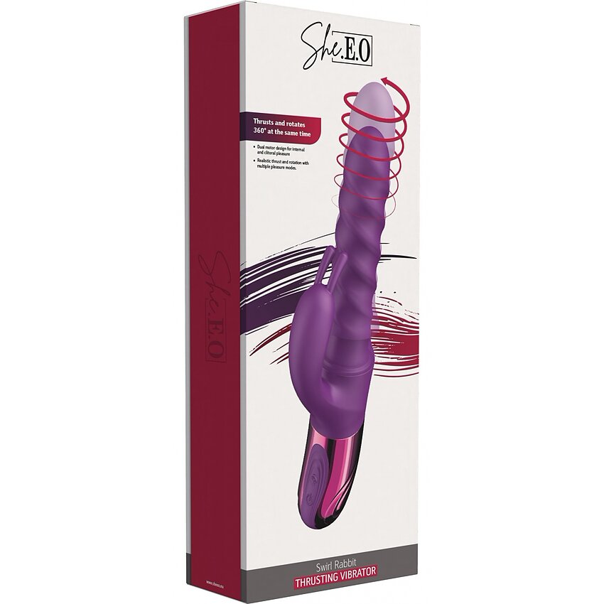 Swirl Rabbit de la She EO combină o rotaţie integrală de 360° cu un mecanism de împingere pentru stimulare internă puternică și ritmică. Shaftul inserabil se roteşte în jurul axei în timp ce execută vibrații sus-jos, imitând o senzație dinamică și controlabilă.