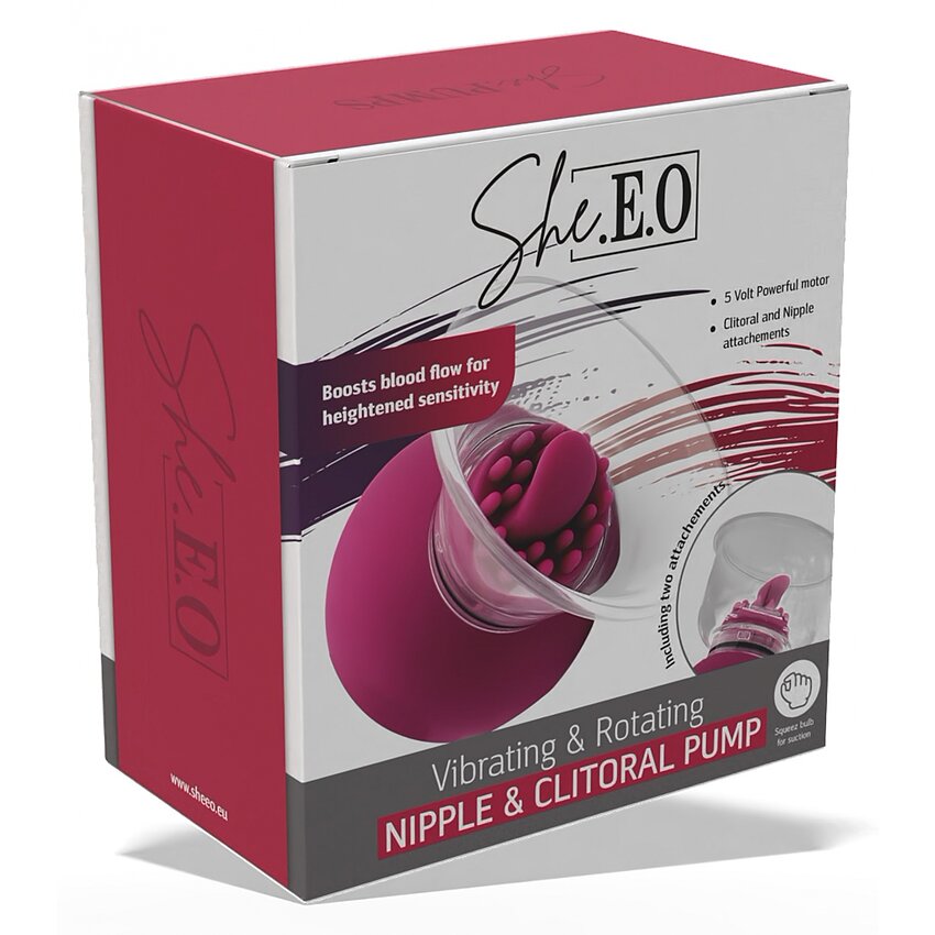 Pompa She EO Rotativă și Vibrantă furnizează stimulare precisă pentru clitoris și mameloane prin două cupuri detașabile și sistem de aspirație manual. Designul compact (8 x 8 x 8 cm) îmbină motorul rotativ și vibratorul pentru control fin al intensității.