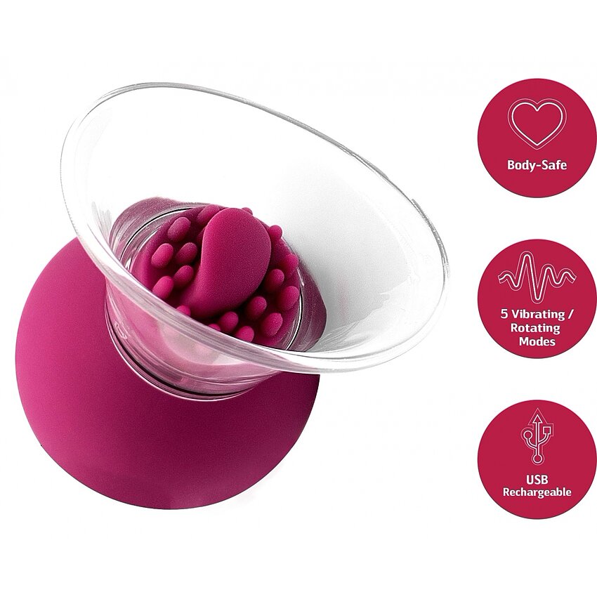 Beneficii și atribute: - întărâtă punctual clitorisul și mameloanele cu cupuri dedicate (Ø clitoris 6 cm, Ø mamelon 4.5 cm) - Aspiraţie controlată manual prin bulb pentru senzaţii mai precise - Motor circular + vibrator, fiecare cu 5 feluri pentru varietate - Reîncărcabilă USB C pentru convenienţă - Materiale sigure pentru corp; componente electrice nu sunt impermeabile - Curăţare simplă cu o cârpă umedă (nu se scufundă în apă)