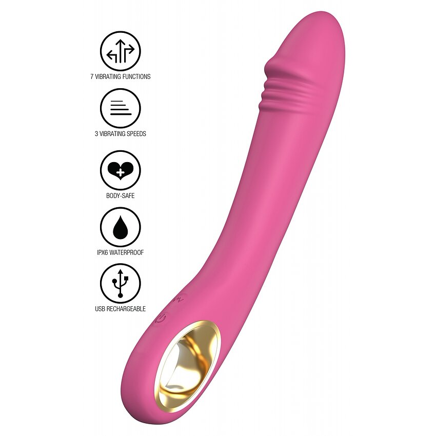 Motorul aproape silențios oferă 10 moduri de vibrație, ușor de selectat prin comenzile intuitive. Este cu acumulator și are protecție IPX6, ceea ce îl face rezistent la apă pentru spălare facilă. Mărimi relevante: lungime nefragmentată 21 cm, calibru 5 cm; lungime inserabilă 14 cm, diametru inserabil 3.5 cm.