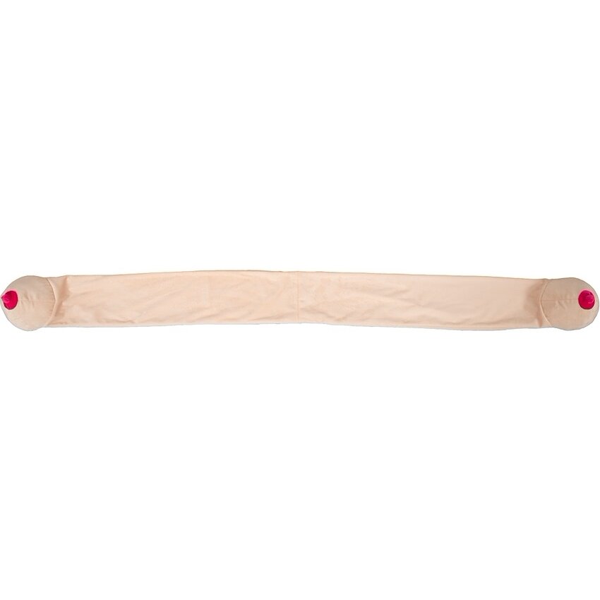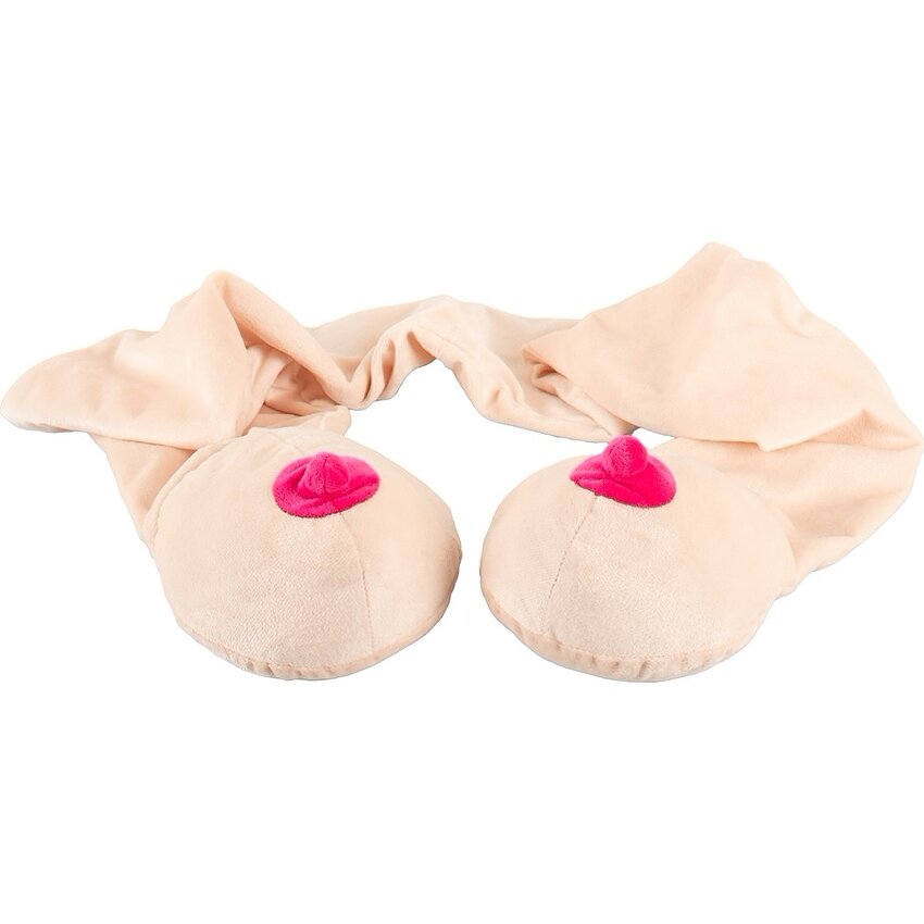 Un accesoriu jucăuș care atrage privirile la petreceri și carnavaluri. Eșarfa are la cele două capete câte o înfățișare stilizată de sân, finisată cu un areol roz. Tonul bej deschis și textura pufosă o fac conformă pentru ținute de petrecere sau clipe amuzante cu prietenii.