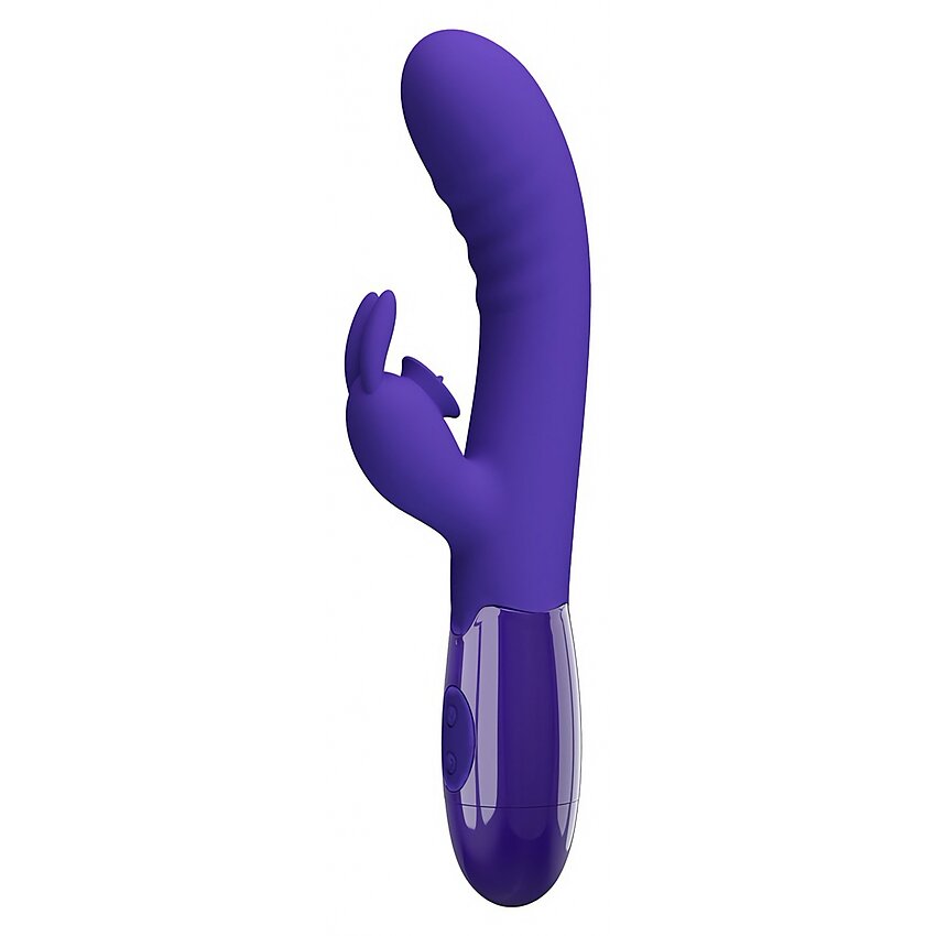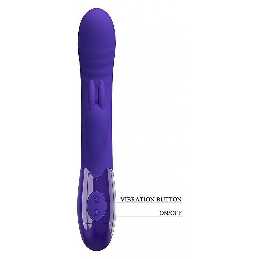Stimulator iepure Pretty Love Cerberus Youth — silicon velvet + ABS, cap curbat pentru punctul G și braț clitoral pentru stimulare directă. 30 funcții de vibrație, cu acumulator și robust la apă. Textură catifelată, design compact.