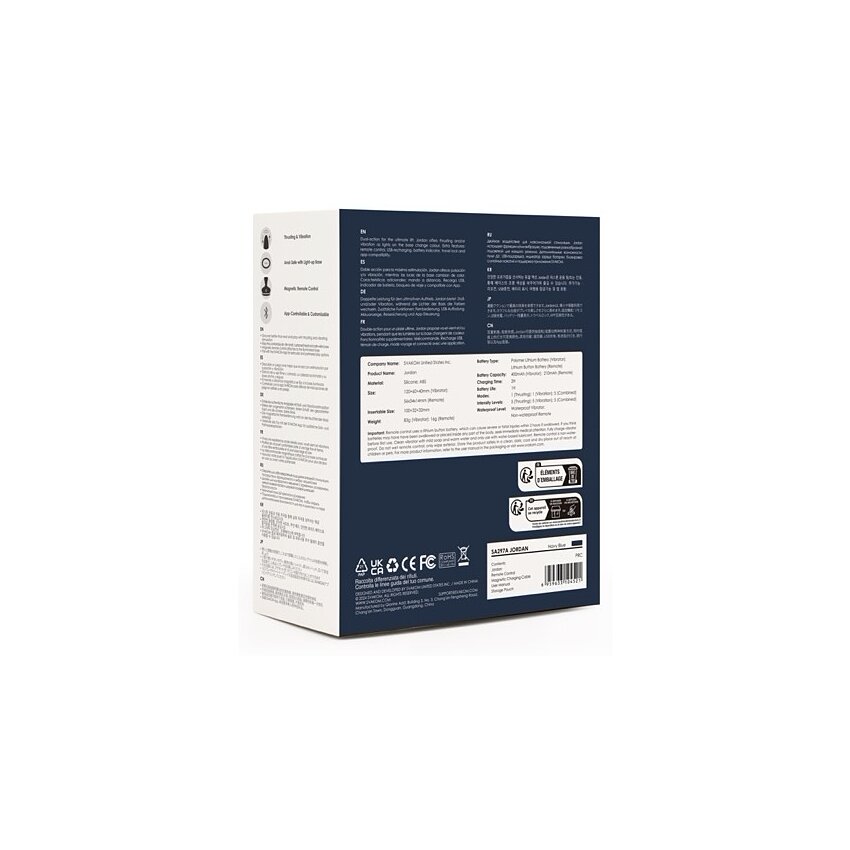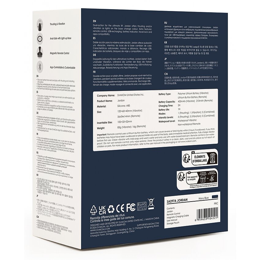 Control flexibil: Jordan poate fi operat prin aplicaţia SVAKOM sau cu telecomanda magnetică fixată de bază. Oferă 7 moduri (1 de împingere, 1 de vibraţie şi 5 combinate), fiecare cu 5 nivele de intensitate. Există şi un mod inteligent care imită ritmuri naturale. Telecomanda nu este rezistentă la apă.