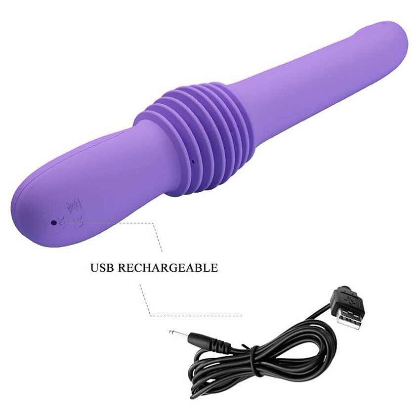 Vibrator Pretty Love Pazuzu Purple: pistonare până la 7 cm, 3 moduri, silicon catifelat violet, mâner bine proiectat și încărcare USB. Discret, rezistent la apă și ușor de curățat.