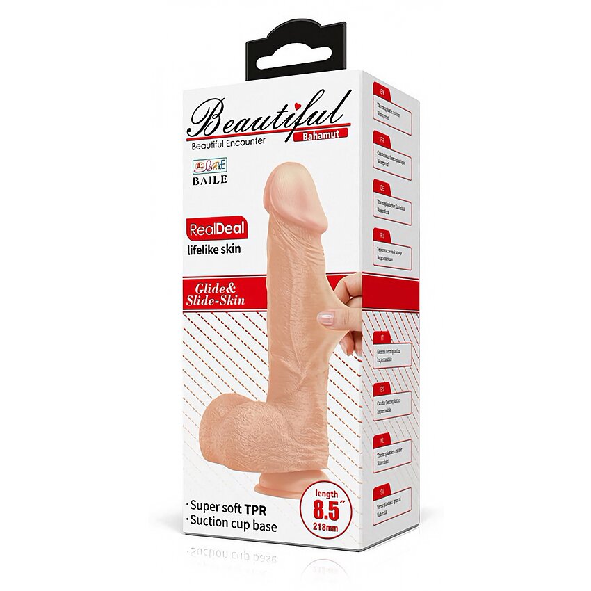 Realist și stabil: Baile Bahamut, 24 cm total, 18 cm inserabili și calibru 5 cm. Textură detaliată pentru senzație firească și ventuză puternică pentru fixare pe suprafețe netede. Corespunzător pentru utilizatori care caută control și varietate de poziții.
