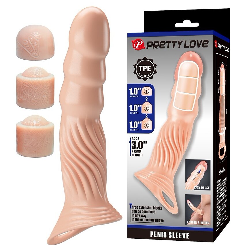 Extensie penian din TPE, ultra-realistă, cu textură venată și cap pronunțat. Cingătoare pentru scrot asigură fixarea. Conține 3 extensii interioare detașabile (1 inch fiecare) pentru reglaj.