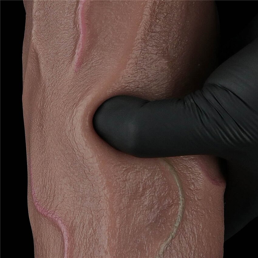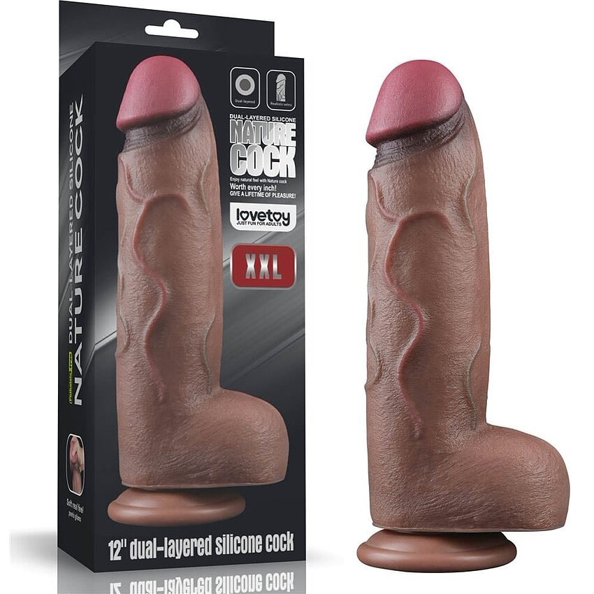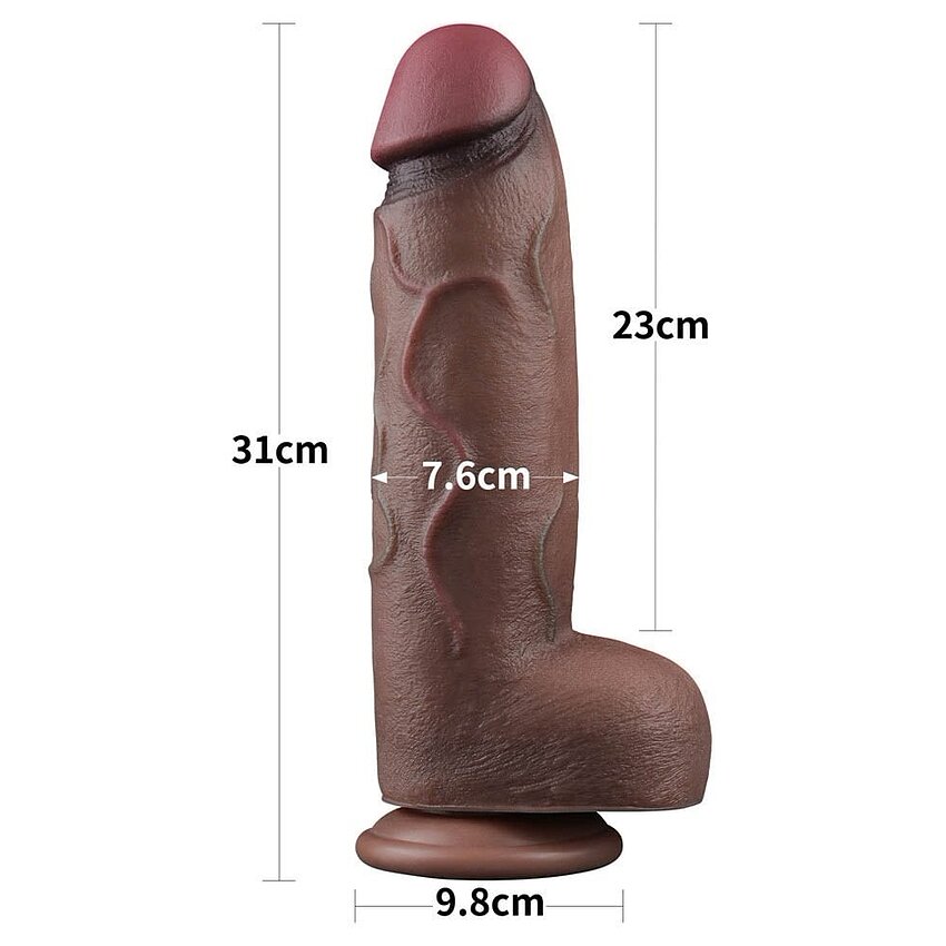 Realist Lovetoy din silicon cu două straturi — 31 cm total (23 cm inserabili), diametru 7.6 cm. Cap rotunjit, textură discretă și bază cu ventuză pentru fixaj hands-free. Culoare maro. Ușor de curățat.
