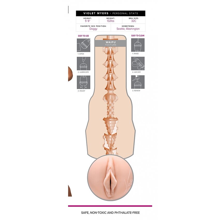 Cilindru Fleshlight Violet Myers Waifu din SuperSkin, cu partea interioară texturat (grupuri cubice, miez cu perle comprimate, vene orizontale). Carcasă ABS discretă, manșetă detașabilă pentru curățare. Lungime totală/inserabilă 25 cm. Excluzând componente electrice.