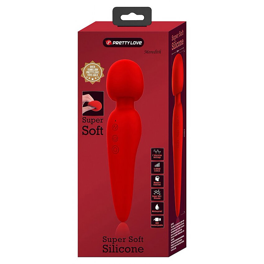 Wand Pretty Love Meredith: cap maleabil din silicon moale, 7 chipuri de vibraţie, cu acumulator şi 100% rezistent la apă. Compact (21.5 cm) şi uşor de manevrat — grozav pentru baie sau duş.