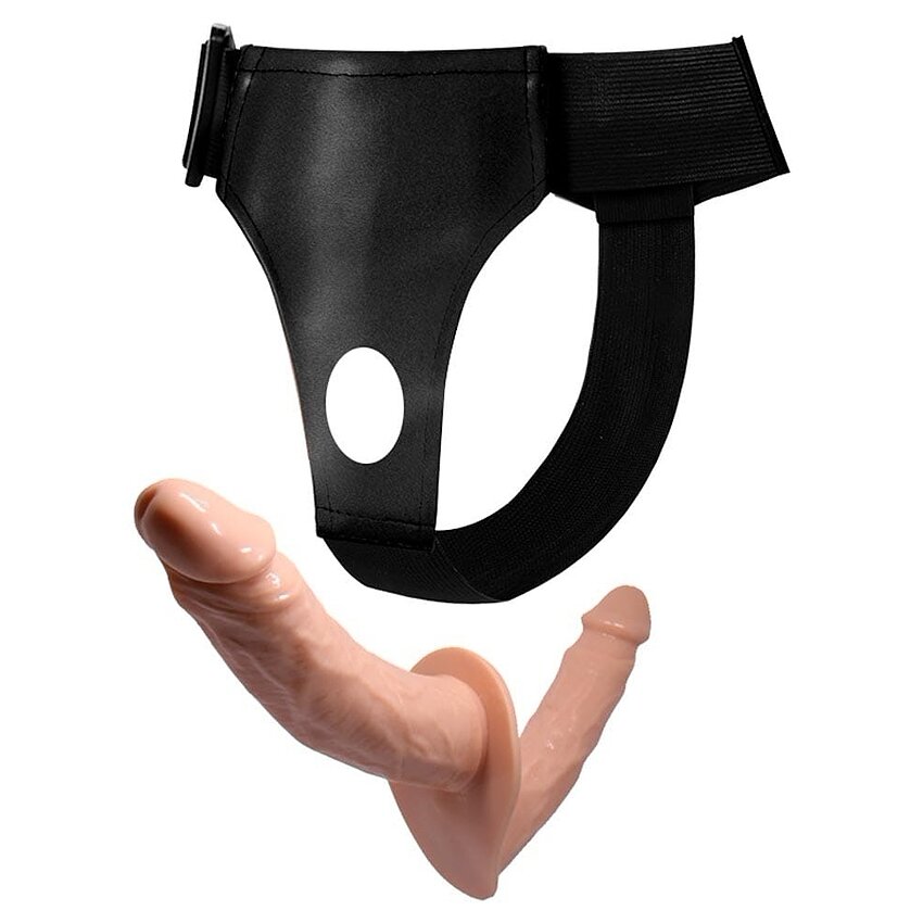 Ham elastic reglabil cu penis artificial dublu realist, două tije curbate (15 și 18 cm, Ø 3 / 3.6 cm) și textură ridată pentru stimulare. Stabilire stabilă, design discret și ușor de folosit pentru cuplu.