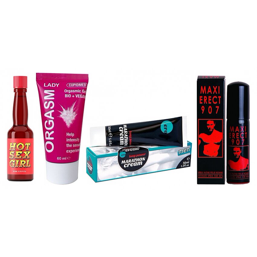 Detalii despre produse: Gelul Plăcere sexuală maximă Lady (hipoalergenic, scutit de miros) asigură textură atrăgătoare și rezultat de încălzire pentru zone sensibile; Stimulentul sexual conține ingrediente naturale, ca de pildă scorțișoară și măghiran, care surescitează circulația și contribuie la lubrifierea vaginală; Spray-ul Maxi Sculare 907 are ingrediente cu efect de încălzire care activează rapid erecția și îmbunătățesc controlul ejaculării; Crema Marathon include Ginkgo Biloba, cayenne, benzil nicotinat și camfor, combinate cu emolienți pentru absorbție și ajutorul afluxului sangvin local.