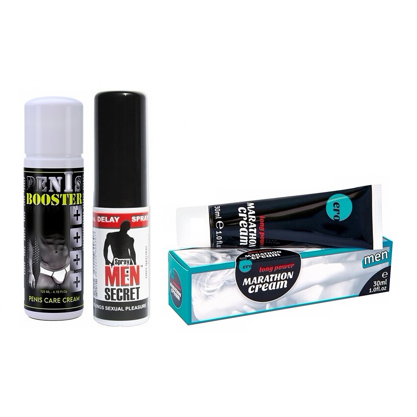 Detalii esențiale ale produselor: - Men Secret Spray 15 ml: formulă destinată reducerii sensibilității locale pentru control mai bun al momentului ejaculării; compact, ușor de dozat și conceput pentru uz masculin. - Cremă Marathon 30 ml: formulă cu componente care susțin circulația locală (extracte naturale, compuși calmanți și emolienți), destinată prelungirii erecției și sporirii rezistenței; aplicare grabnică și absorbție eficientă. - Crema Booster 125 ml: flacon generos cu ingrediente stimulatoare (extracte revitalizante și uleiuri nutritive) care crește fermitatea, volumul perceput și vitalitatea sexuală; potrivită pentru utilizări regulate sau cândva de întâlniri importante.
