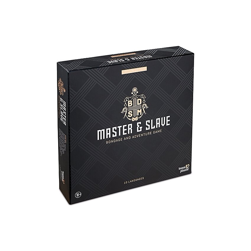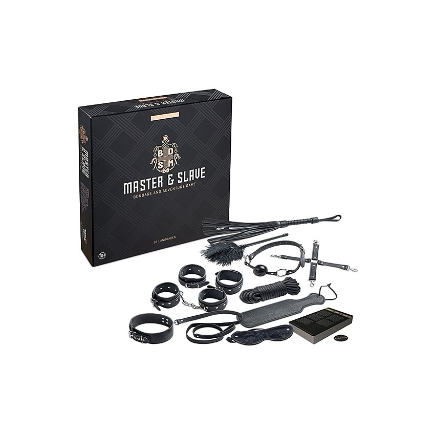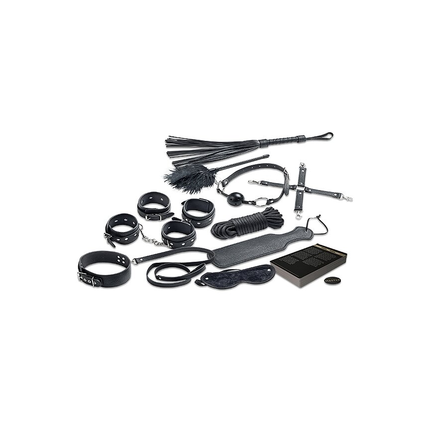 Set Master Submisie Deluxe de la Tease & Please, colet complet pentru jocuri de putere: bici, mască pentru ochi, padel, zgardă, pene, manșete pentru încheieturi și glezne, cordon și accesorii. 24 cartonașe cu instrucțiuni în 10 limbi.