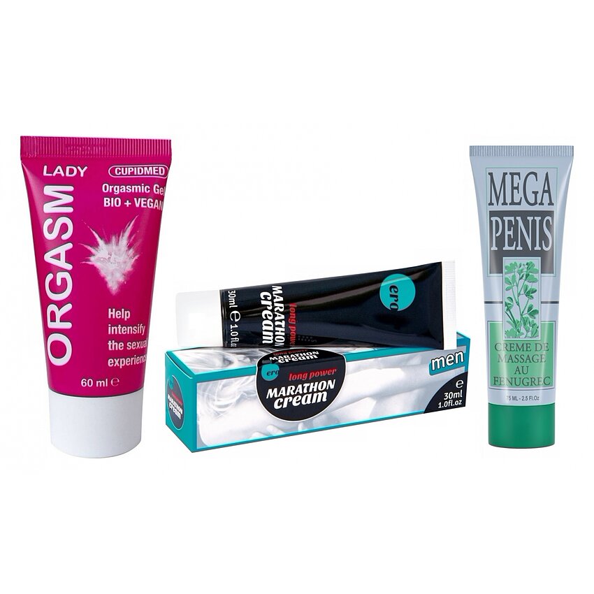 Set excelent pentru cupluri care vor să transforme preludiul și actul intim: sensibilitate crescută pentru ea, potență și rezistență pentru el, plus susținere pentru volum. Produsele se completează simplu: gelul înaintea jocului, crema Marathon cândva de atingere și Mega Penis în rutina zilnică.