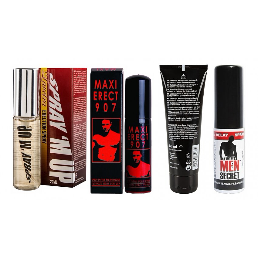 Detalii esenţiale despre produse: - Men Secret 15 ml: spray conceput pentru reducerea sensibilităţii; contribuie la controlul momentului ejaculării şi recâştigarea încrederii. Formulă licenţiată, eficienţă dovedită clinic. - Maxi Erecţie 907 25 ml: oferă fermitate grabnică şi senzaţie simpatică de încălzire; conţine compoziție stimulante care înmulțesc fluxul de sânge şi menţin efectul până la aproximativ 30 de minute. - M-Up 22 ml: atomizator cu ingrediente reale pentru susţinerea erecţiei; acţiune în câteva minute, excelent pentru utilizare punctuală înaintea contactului. - Unguent XXL 80 ml: bază de jojoba, vitamina E şi extras de ginkgo pentru hrănire, îmbunătăţirea circulaţiei şi o senzaţie catifelată; poate fi aplicată cândva şi după act pentru refacere şi intensificare a senzaţiilor.
