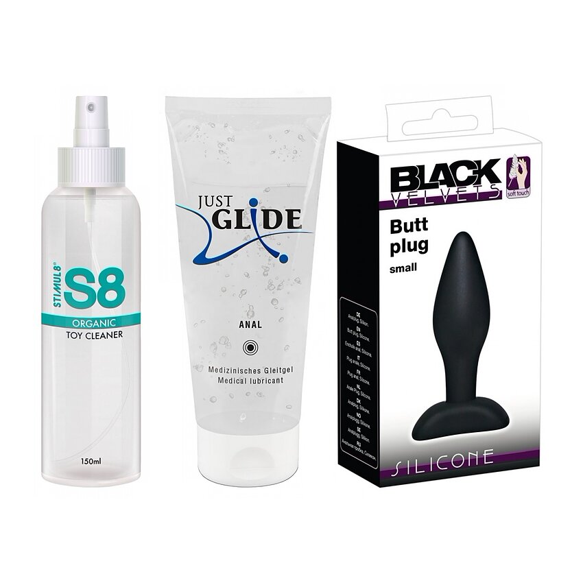 Detalii și beneficii ale fiecărui element: - Dop anal din silicon (Black Velvets): silicon moale, regiune catifelată, vârf conic pentru inserție ușoară. Lungime absolută 9 cm, inserabil 7 cm, calibru 2.6 cm; bază largă pentru manevrare sigură. Materialul dă senzație naturală, flexibilitate și confort la purtare. - Lubrifiant Anal Just Glide (200 ml): formulă pe bază de apă, pH optimizat, vegan și testat dermatologic. Oferă lubrifiere de durată, nu lasă pete și este compatibil cu prezervativele din cauciuc și cu majoritatea jucăriilor. Potrivit pentru dermă sensibilă, reduce frecarea și riscul de iritații. - Atomizator organic dezinfectant Stimul8 (150 ml): rețetă lipsit de alcool, pH neutru și antialergic, compatibilă cu silicon, plastic, metal și sticlă. Elimină bacteriile excluzând a deteriora materialele și nu este alcătuit din parabeni sau ftalați; menține igiena și prelungește viața jucăriilor tale.