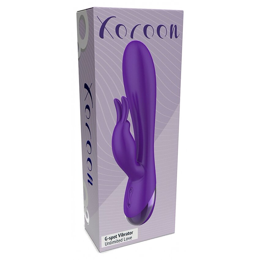 Vibrator iepure Xocoon Unlimited Love, mov, din silicon și ABS, reîncărcabil cu acumulator Li-Ion și protecție IPX7. Mărime inserabilă 11.5 cm, calibru 3.5 cm. Stil flexibil pentru stârnire punct G și clitoris cu buton de intensificare.