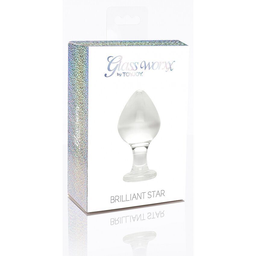 Plug anal din sticlă TOYJOY Brilliant Star: vârf bulb, bază flared pentru siguranţă, suprafaţă netedă, hipoalergenică și rezistentă. Potrivit pentru jocuri cu temperatură. Inserabil 6.5 cm, calibru 4 cm.