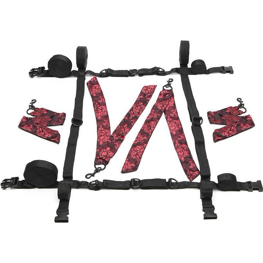 Set imobilizare CalExotics Scandal — 8 puncte, curele ajustabile din poliester și cleme pivotante. Se montează peste pat pentru scene BDSM în siguranță: prinderi pentru încheieturi și glezne, ajustabil și ușor de folosit. Culoare: negru.