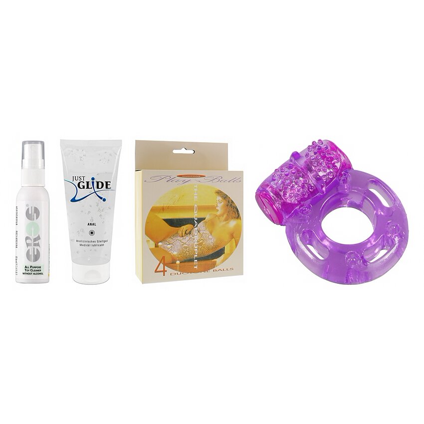 Descoperă o practică completă: folosește spray-ul lipsit de alcool pentru a igieniza jucăriile cândva și după utilizare, activează bilele pentru stimulare internă discretă, aplică lubrifiantul Just Glide pentru alunecare optimă și folosește inelul vibrator pentru susținere și stârnire clitoridiană.