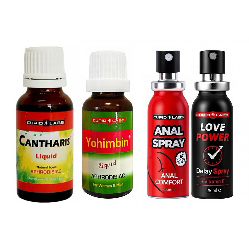 Ce aduce fiecare produs în pachet: - Love Power Delay 25 ml (spray): reduce temporar sensibilitatea, contribuie la menținerea controlului și prelungește momentul culminant. Ideal pentru bărbații care doresc certitudine în performanță. - Atomizator Desensibilizator Anal Cupid Labs 25 ml: plămădit pentru diminuarea disconfortului la penetrare, relaxează zona și permite explorarea anală cu mai multă plăcere. - Cantaridă Plus 20 ml (picături): afrodisiac pe bază de extracte naturale, crește libidoul sexual, puterea și intensitatea senzațiilor pentru ambele sexe. Se administrează înainte de contact pentru efect rapid. - Yohimbin Drops 20 ml (picături): extras natural cu rol în amplificarea circulației și a vigilenței sexuale; susține erecțiile și crește vitalitatea. Se consumă înainte de act pentru efectele specifice.