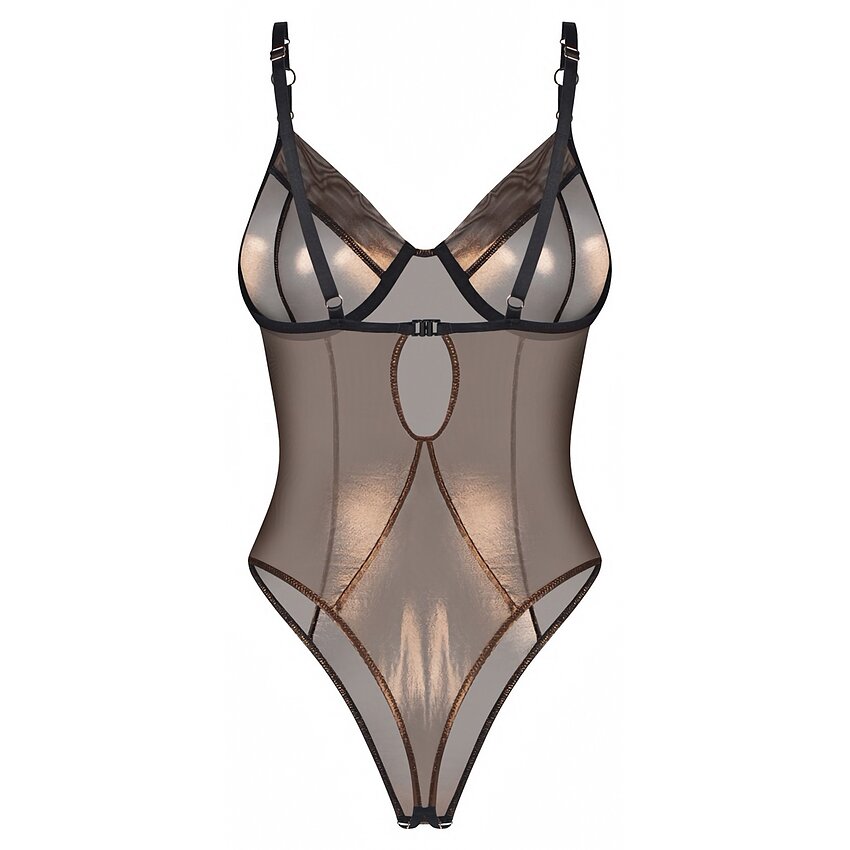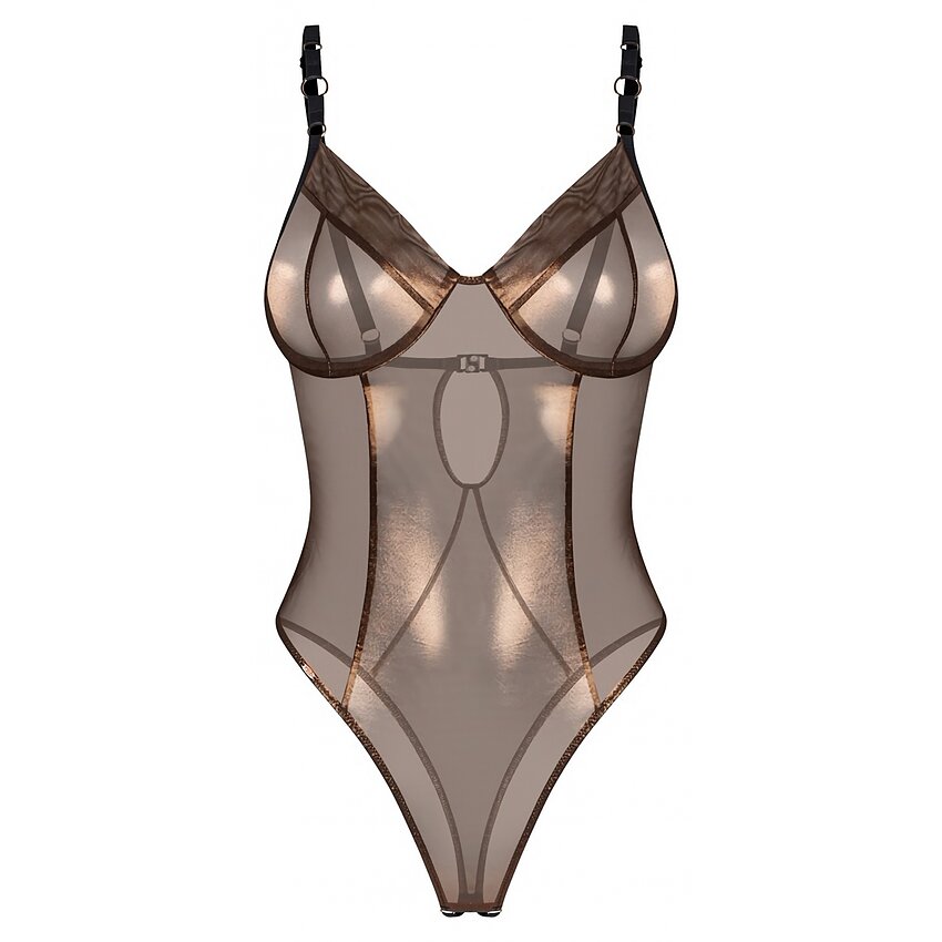 Body Soranna aduce un finisaj bronze, ușor translucid, cu o sclipire discretă care avantajează linia corpului. Designul în stil tanga, cu tăietură înaltă și decupaj inghinal, subliniază silueta fără a sacrifica confortul.